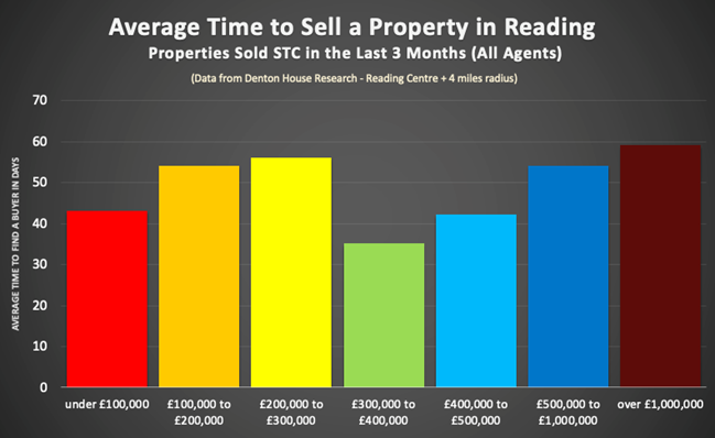 Reflecting on this independent research—which focuses exclusively on Reading—it’s fascinating to observe how these different price segments (or micro-markets) are currently performing when we look at the average time it takes to secure a buyer in the Reading area. The average time to find a buyer in the last 3 months in Reading for those properties that have agreed a sale on them is as follows …